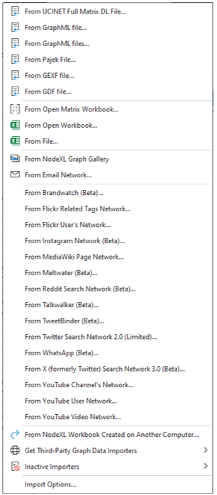 Below you find a list of currently active NodeXL Pro data importers. You can access these importers in the NodeXL Excel ribbon via NodeXL Pro > Data > Import.