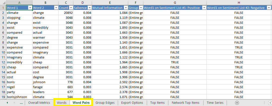 Note (!): The original word and word pair spreadsheets also contain counts by group as specified in the dialog box above. Make sure to only copy Word Pairs with the category “Entire Graph” in Column F “Group”. You can of course choose to focus on a certain group and create a network just from e.g. G1 or any other group you are interested in.