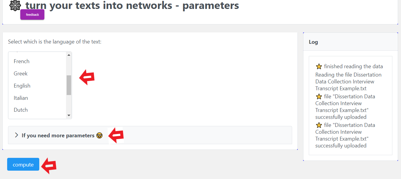 Step 7. Select the corresponding language of your file containing the transcript, then press if you need more parameters (this is only if you want to make some additional adjustments), finally press Compute.