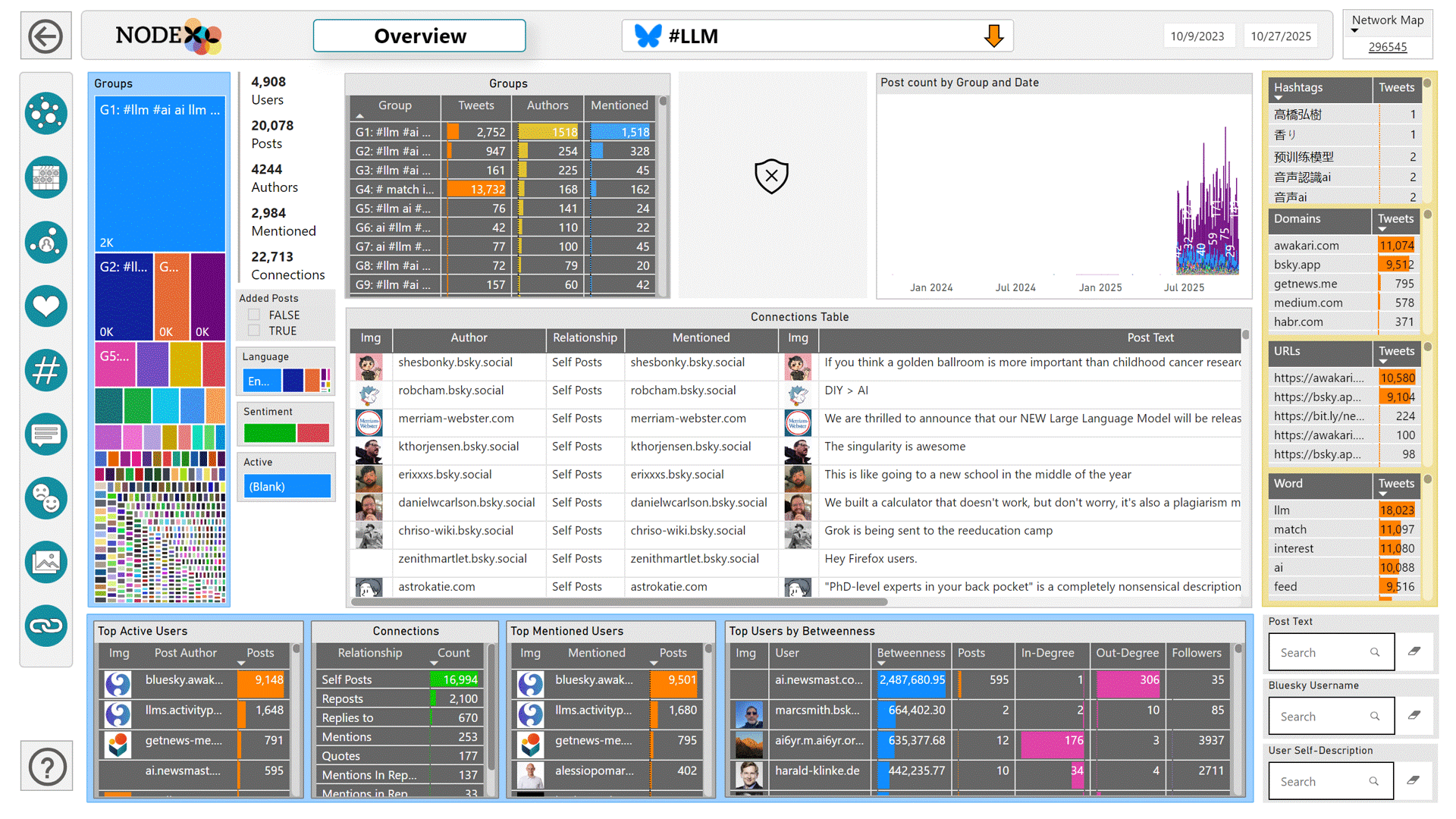 Create interactive dashboards that reveal the key people, groups, topics, messages, and events in a collection of messages from BlueSky.