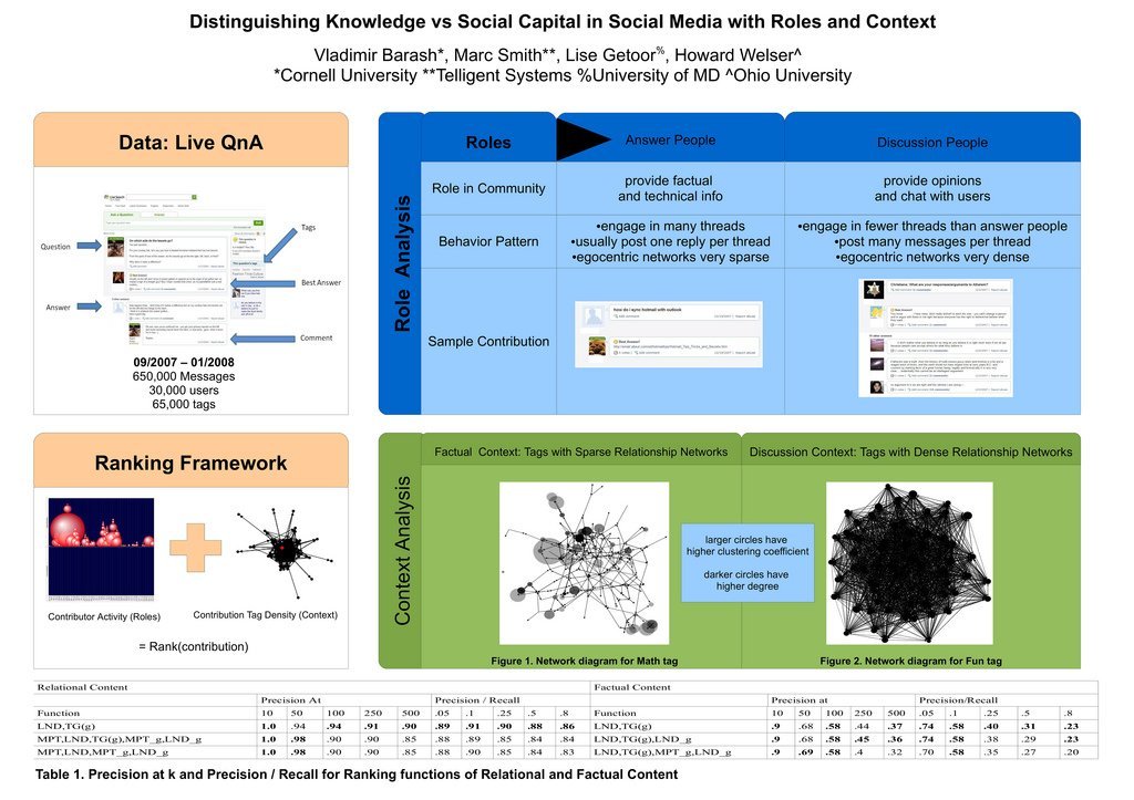 On Tuesday night Marc Smith and I will be presenting the poster for our paper, “Distinguishing Knowledge vs Social Capital in Social Media with Roles and Context” at the International Conference for Weblogs and Social Media. You can find the poster, co-authored with Marc Smith (Telligent Systems), Lise Getoor (University of Maryland) and Howard T. Welser (Ohio University), here. The full text of the paper has more information, but the poster is a good summary of the key concepts in the paper: