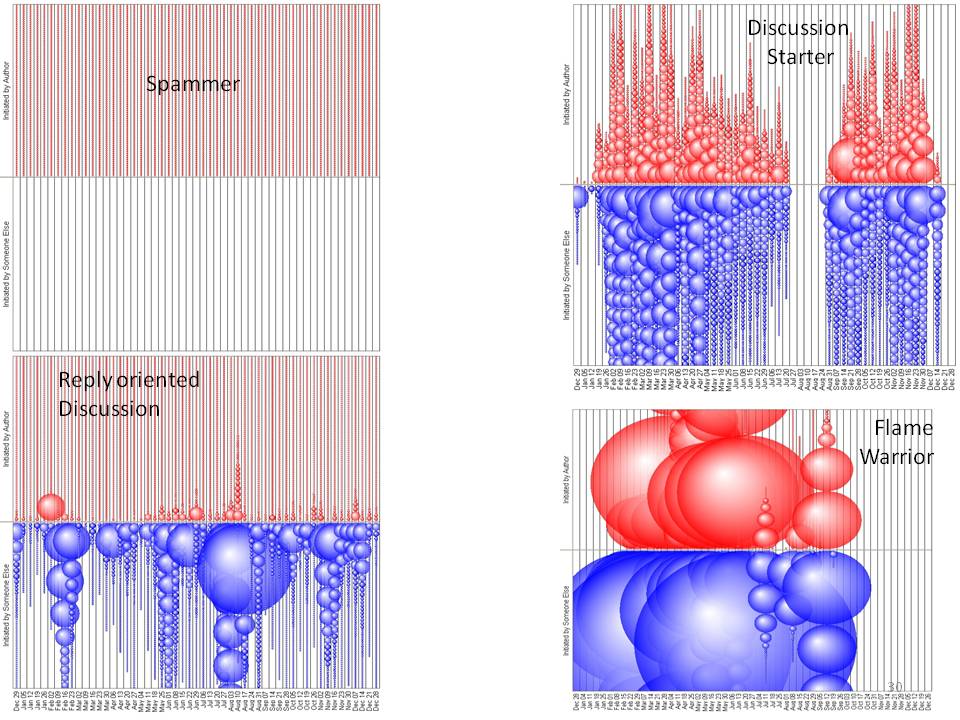These patterns illustrate the ways that spammers create only initial turns, never replies. The spammer in the upper left shows a pattern of never skipping a week, and continuously posting just a single message in each thread. In contrast, the remaining Author Lines represent the pattern of heavy discussion people who may verge on flame warriors. The big bubbles indicate the author contributed hundreds of messages to that thread in just one week. The presence of multiple big bubbles indicates the pattern this author has of contributing hundreds of messages to multiple threads over multiple weeks. This high level of focused contribution is an indication of a possible conflict (or perhaps just a spirited debate) and is far different from the pattern of contribution created by answer people or even more moderate discussion people.