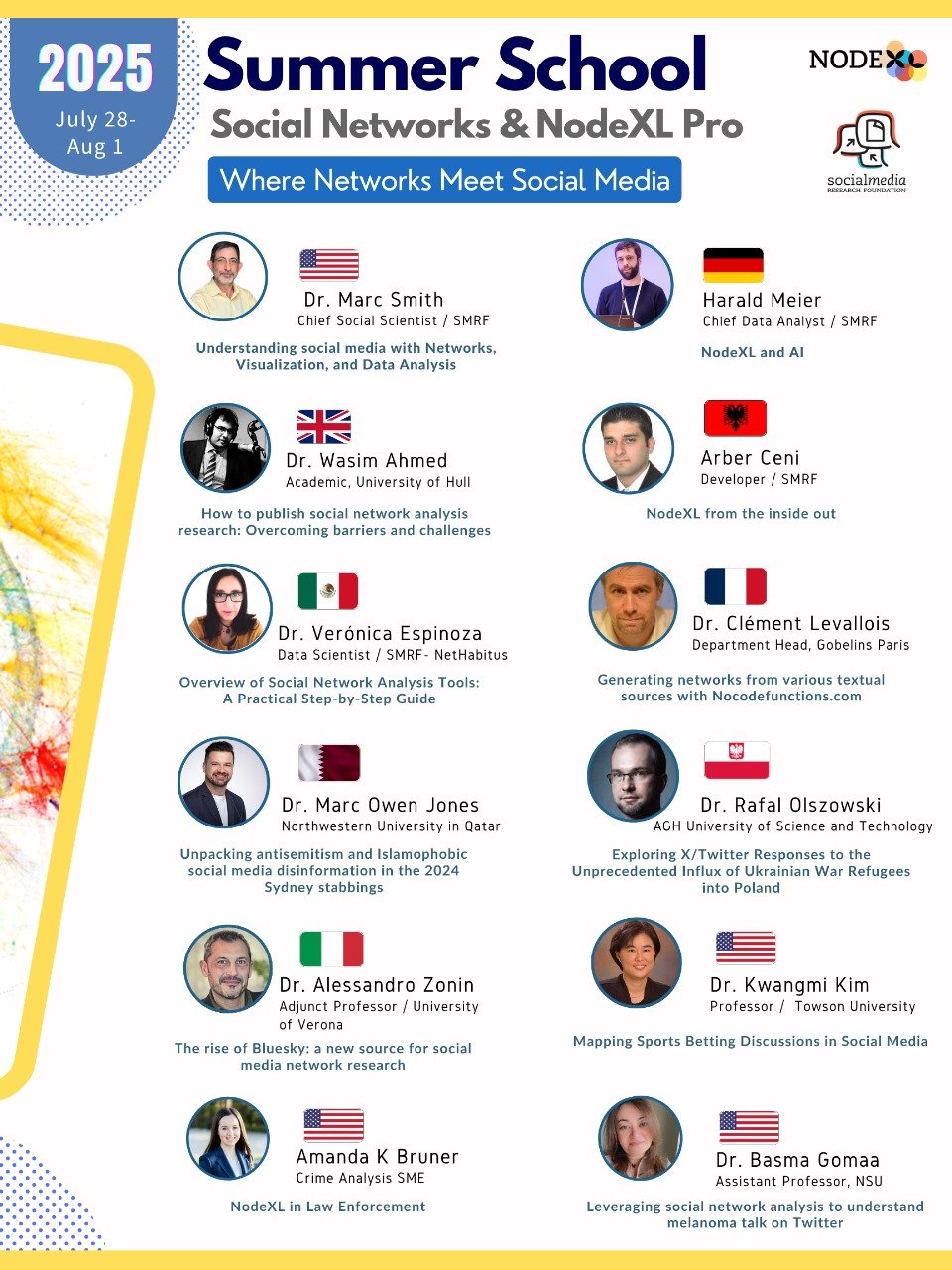 This summer, join leading researchers and practitioners at the NodeXL Pro Summer School 2025, a thoughtfully designed five-day online program running from Monday, July 28, 2025 to Friday, August 1, and discover how to transform social media data into publishable insights, no coding required.
