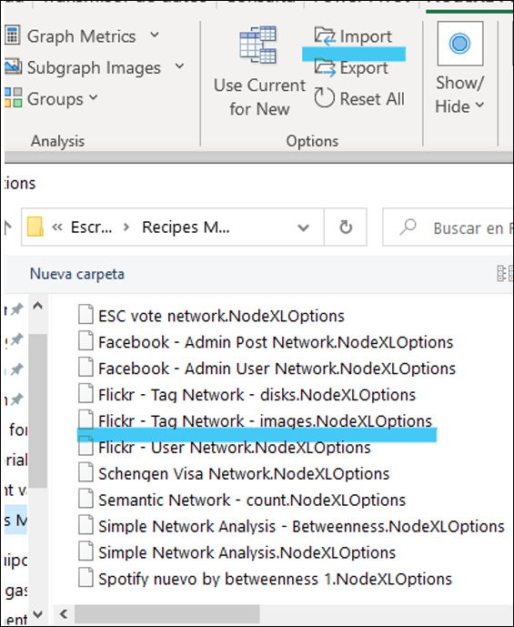 When the data download is finished, open the Options Import menu via Options > Import and select the Flickr Tag Network options file and click open (see Tutorial requirements above).