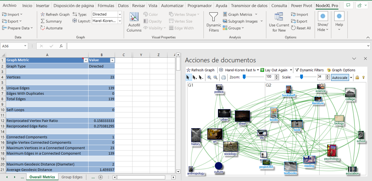 When automation is finished, you will see a fully populated NodeXL workbook and the corresponding network graph.