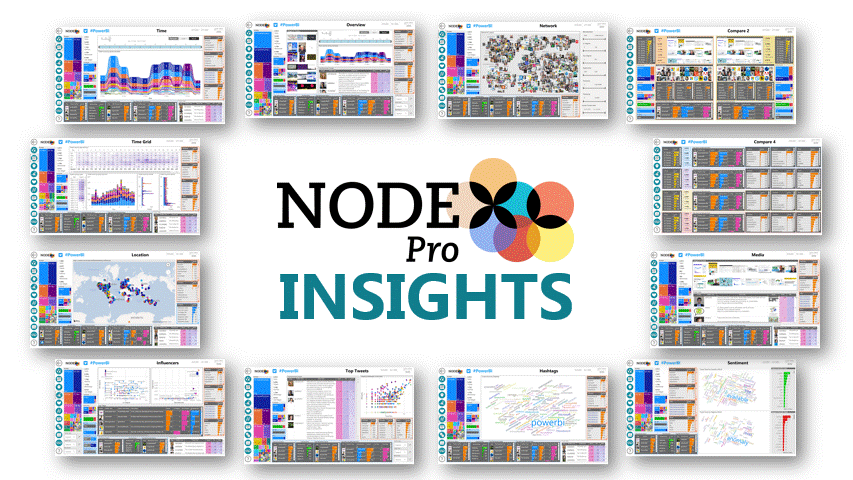 NodeXL Pro INSIGHTS is a Microsoft Power BI report template that creates interactive and shareable network reports from NodeXL Pro data sets. A NodeXL Pro INSIGHTS report makes use of many different data visualizations – from simple tables to hashtag clouds, from image grids to scatter plots. Easily pivot around all social media dimensions: Tweets, users, groups, hashtags, media, sentiment, space and time.