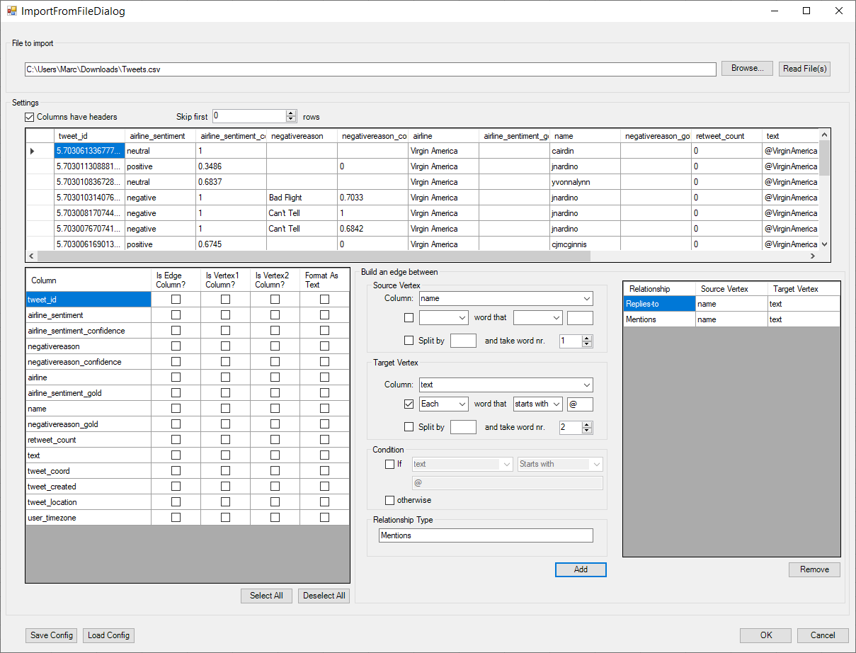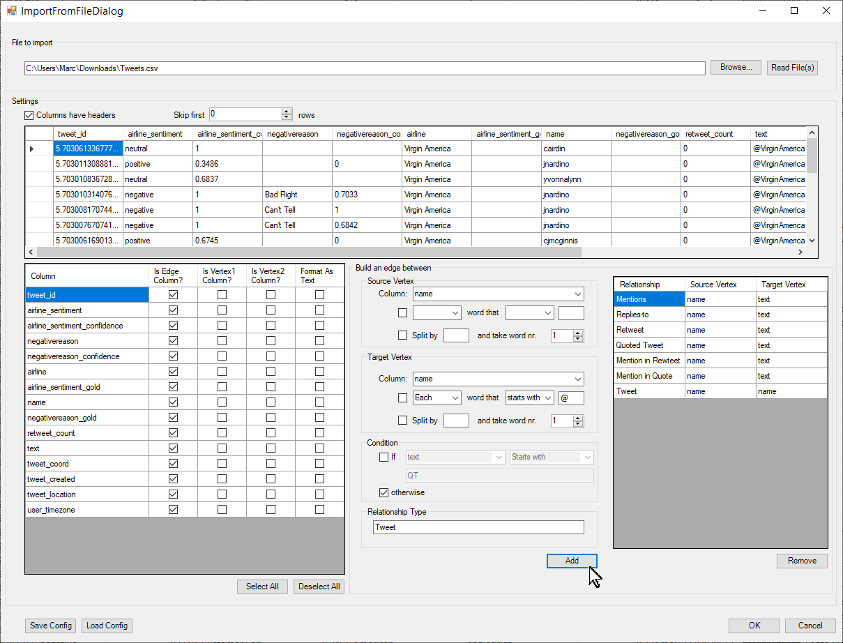 A sample configuration for converting many csv files contain Tweets into the 7 edge types (tweet (post), reply, mention, retweet, quote, mention in retweet, mention in quote) is available here.