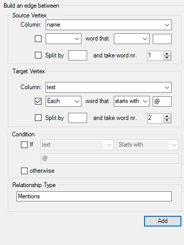 This rule says: the “source vertex” (vertex 1) is the username found in the column “name.” The second vertex is extracted from the column called “text”. In that column we instruct NodeXL that “Each” part of the text that “starts with” the character “@”, but start with the second item found in the string.