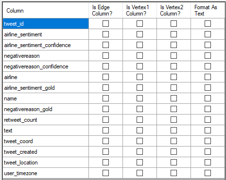 This is a common type of data set with a date and an author and message text along with a number of related attributes. In the NodeXL Import from file feature, you can now see these columns and select the ones that are relevant and map them to the attributes of the connection (“edge”) or to the first person or entity or the second person or entity (Vertex 1 and Vertex 2).