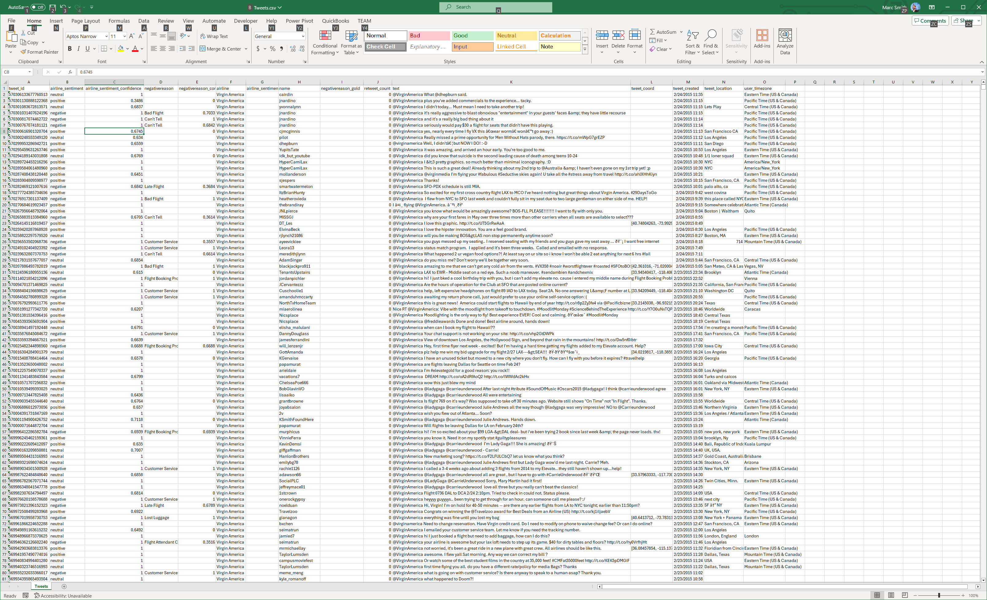 As an example, this is a collection of messages from Twitter that are related to airlines found on GitHub. The file is a CSV collection of data:
