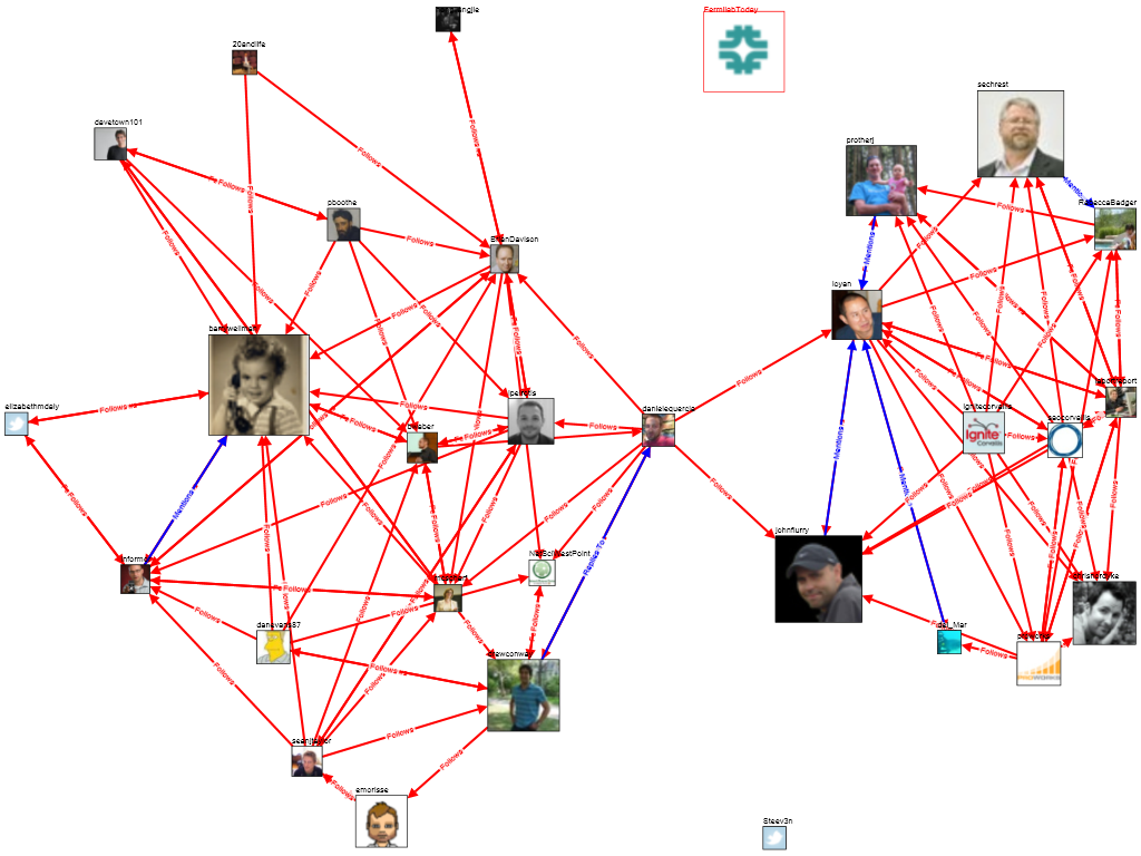 Here, for example, is a map of the connections among twitter accounts that tweeted the “WIN09” tag that was used in the recent Social Networks Summit at NYU (http://winworkshop.net/) The map illustrates the way the summit brought together previously separate clusters of people from the various disciplines that have been attracted to the study of networks in general and social networks in particular. Size of the image equals the number of tweets that person created.