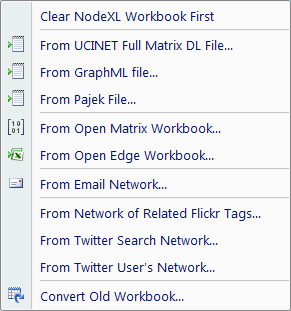 Since NodeXL is intended to support non-programmer network analysts we plan to add support for other network analysis file formats. A leading example is the UCINet format which has the added virtue of holding many sample data sets that are widely used in classes and network course work. If you have a network data file format you would like NodeXL to support feel free to comment here or on the Codeplex NodeXL discussion.