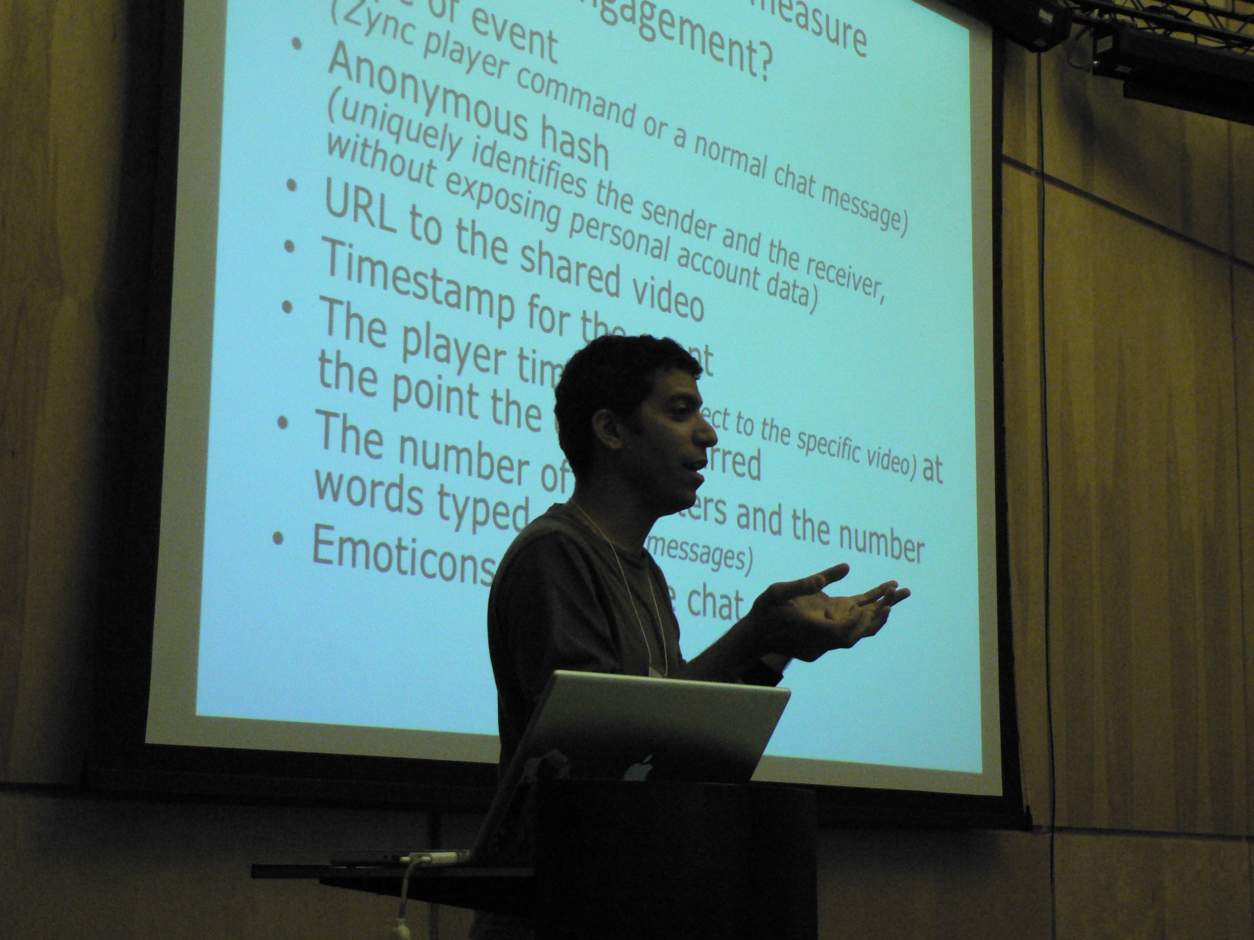 Ayman spoke about measuring engagement in a Yahoo Messenger video sharing and chat feature. He found that chat activity spikes during the credits. Except in Japan where strings of “wwwwwwwwwwwww” denote laughter and continue through out a shared video session.