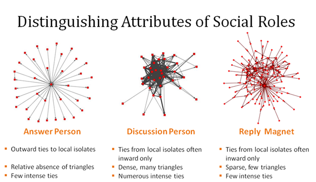 Three roles are particularly critical, despite their relatively rare occurrence in most threaded discussion environments. Answer people are the relatively rare people who provide a useful answer to potentially hundreds of question askers; discussion people reply to one another about the topics introduced by the topic starting “reply magnet”. These roles are visible in the details of the patterns of reply and connection within social media repositories. The relative balance of these roles (and others) determines the nature of the social media space: is it a discussion space, a flame zone, a Q&A exchange spot, or a place to swap binary files? The balance of answer people to discussion people is one dimension of variation among social media spaces, for example.