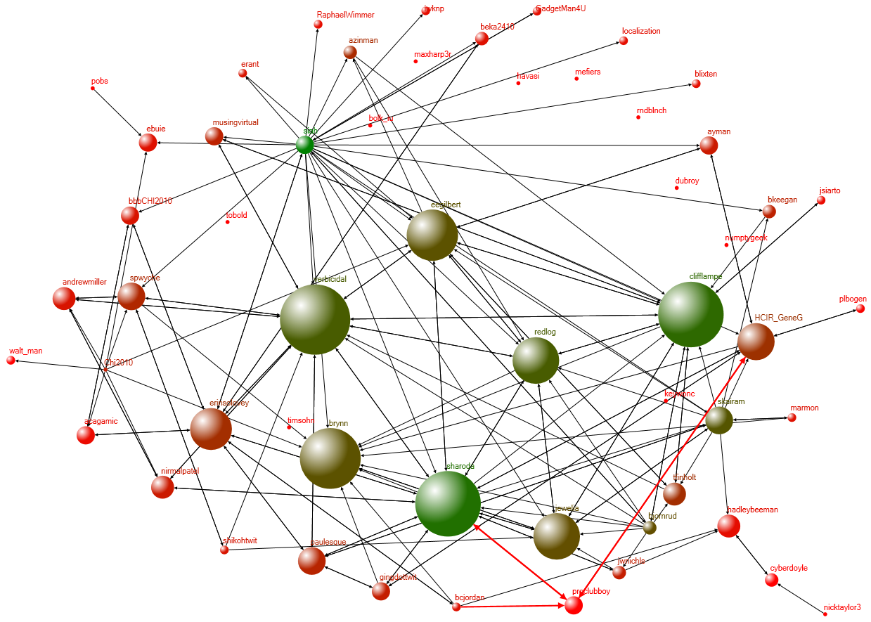 The network created by “Who follows who among the people who tweeted “#CHI2010”. Node size is proportional to total tweets. Generated with NodeXL